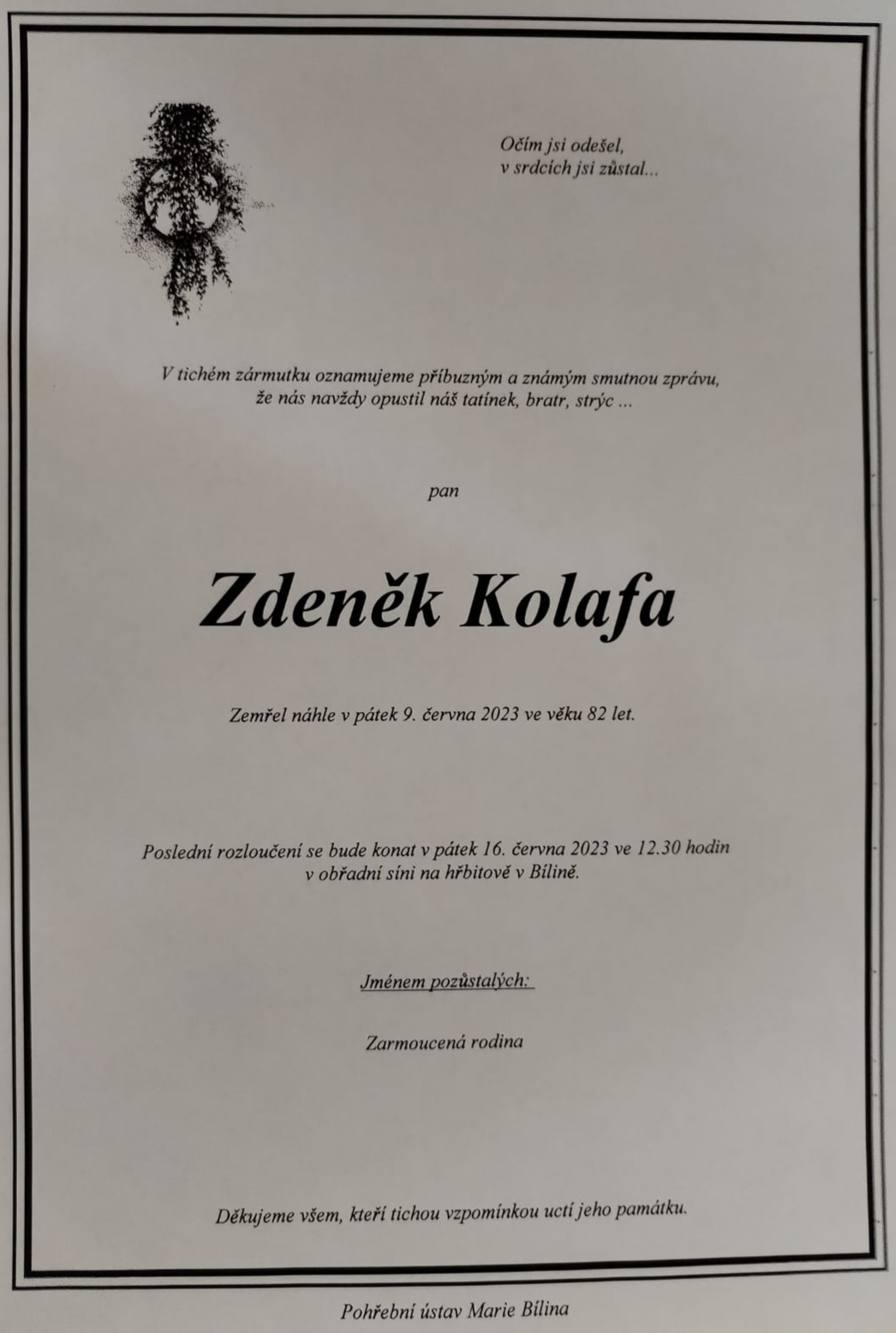 díky za ten věnec. Pojedu v pátek se Zdeňkem rozloučit, jestli by chtěl někdo vzít z Mostu do Bíliny, mohu nabídnout odvoz, zavolejte mi, nebo napište sem.